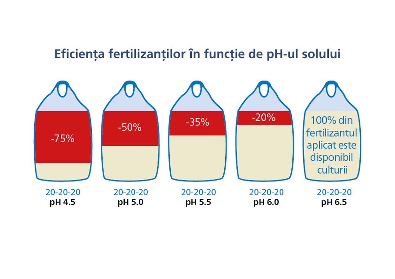 pH-ul acid reduce semnificativ nu numai disponibilitatea calciului, ci și disponibilitatea macronutrienților NPK, uneori cu până la 50%. De aceea, pe lângă măsurarea pH-ului, este importantă și analiză calciului schimbabil, care oferă o imagine mai precisă și ajută la stabilirea corectă a dozei de aplicat pe hectar.