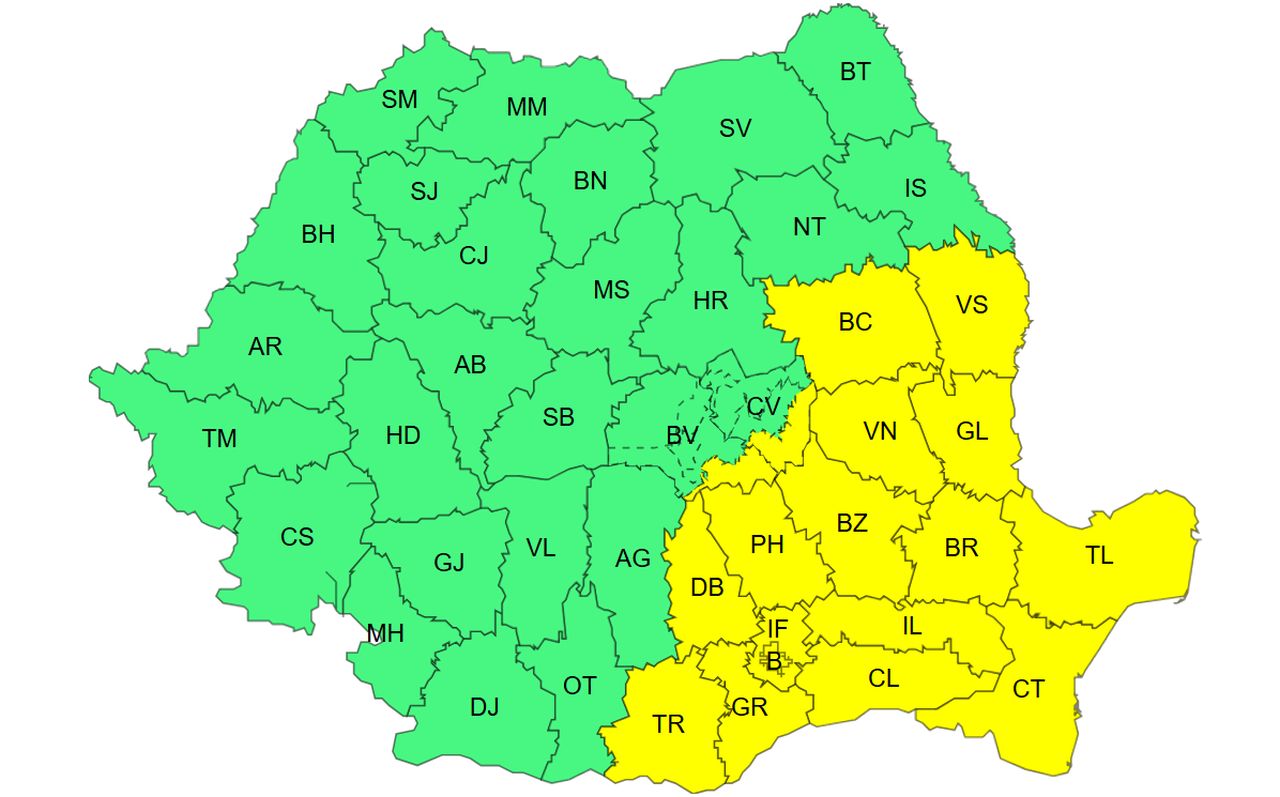 Un alt cod galben va intra în vigoare de mâine seară, marți – 7 octombrie, de la ora 21:00, până miercuri, pe 8 octombrie, la ora 23:00, fenomenele vizate fiind: ploi însemnate cantitativ, intensificări ale vântului, ninsori viscolite la altitudini de peste 1700 m. Astfel, în centrul Moldovei, sudul Transilvaniei, estul și sudul Olteniei și în vestul Carpaților Meridionali va ploua însemnat cantitativ și se vor acumula 25…30 l/mp și izolat 40…50 l/mp. În județele Vrancea, Galați, Buzău, Prahova, Brăila, Ialomița, Călărași, Constanța, Tulcea, Ilfov și municipiul București, vântul va avea intensificări cu rafale de 50…70 km/h. În Carpații Meridionali, la altitudini de peste 1700 m va ninge temporar viscolit (rafale de 60…90 km/h) și se va depune strat de zăpadă (10…30 cm).