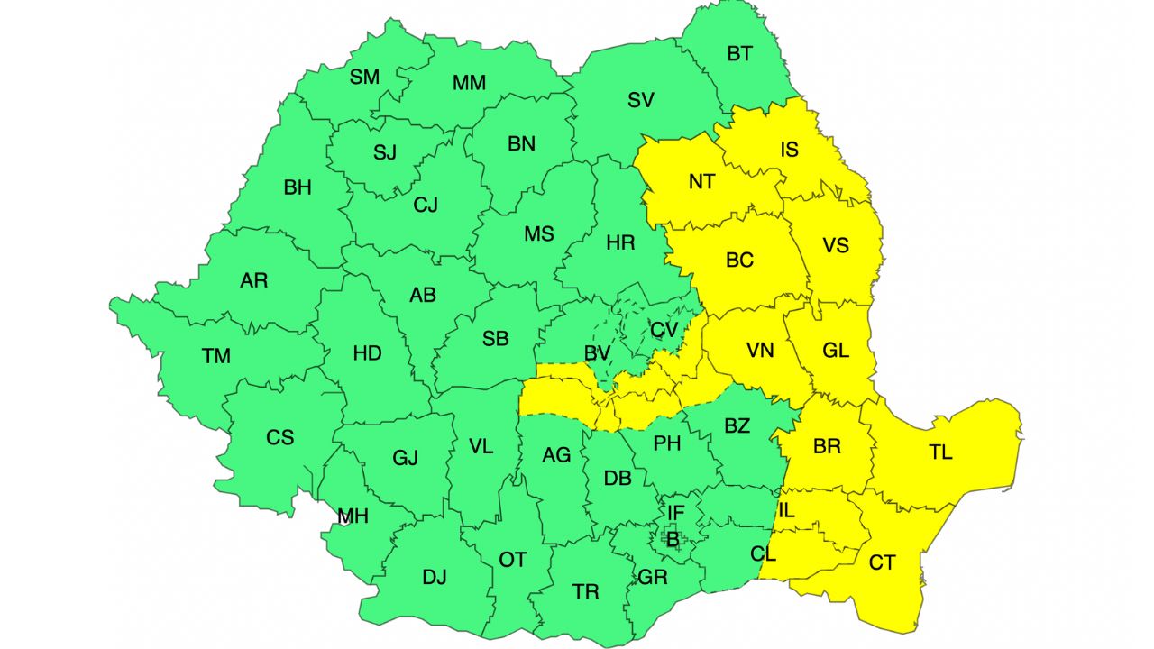 În județele Vrancea, Galați, Buzău, Brăila, Ialomița, Călărași și pe litoral, vântul va avea intensificări cu rafale de 50…70 km/h.