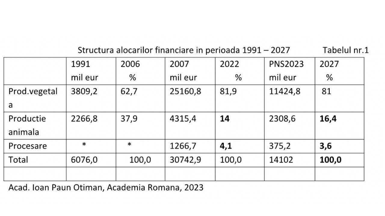 În tabelul numărul 1 sunt prezentate alocările financiare în perioada 1991 – 2027, din care rezultă slaba finanțare a producției animale, comparativ cu producția vegetala, atât în exercițiul financiar, 2007 – 2022, când a fost de 14%, iar procesarea de 4,1 %, cât și în cel din perioada 2023 – 2027, respectiv, 16,4 % pentru producția animală și 3,6 % pentru procesare.