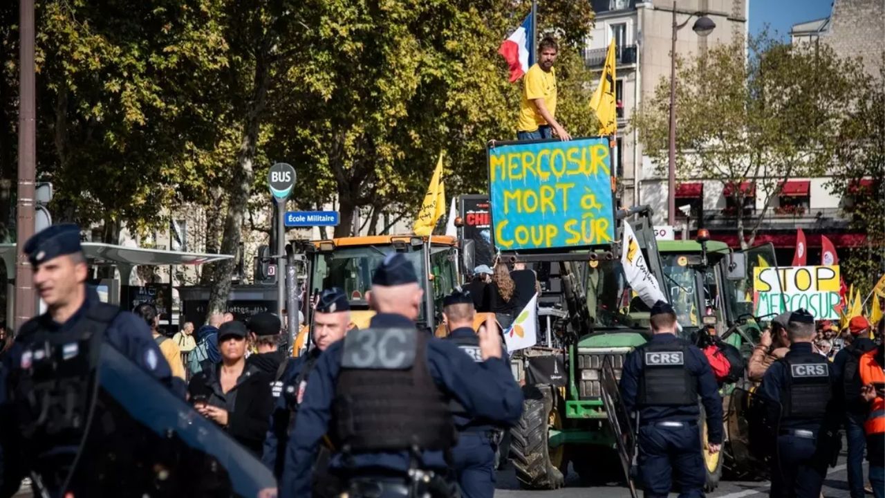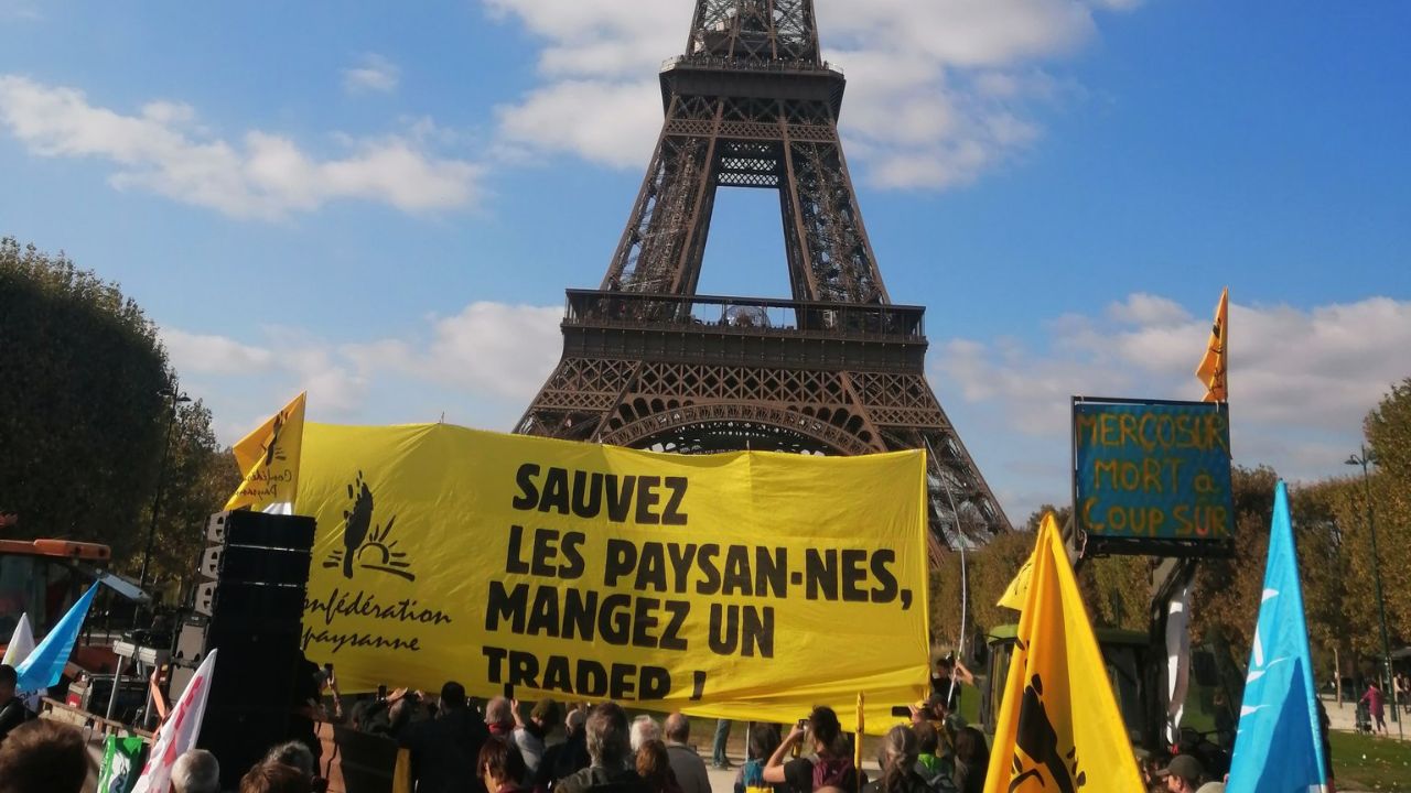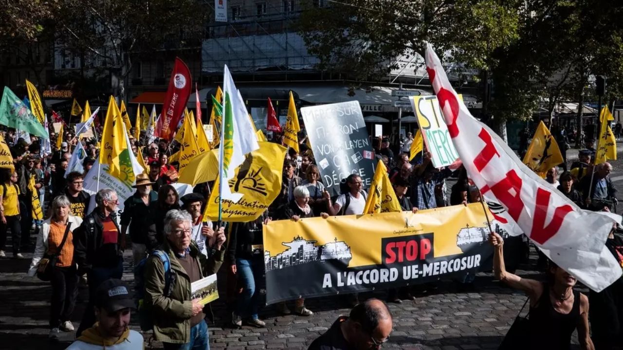 Câteva sute de fermieri au protestat ieri, marți – 14 octombrie, cu tractoarele la Paris împotriva acordului de liber schimb UE -Mercosur. Aceștia au denunțat „concurența neloială” și au militat pentru „demnitatea lucrătorilor” din întreaga lume. Fermierii francezi se tem că li se vor închide afacerile locale, iar consumatorii cu venituri mici vor depinde de hrana importată.