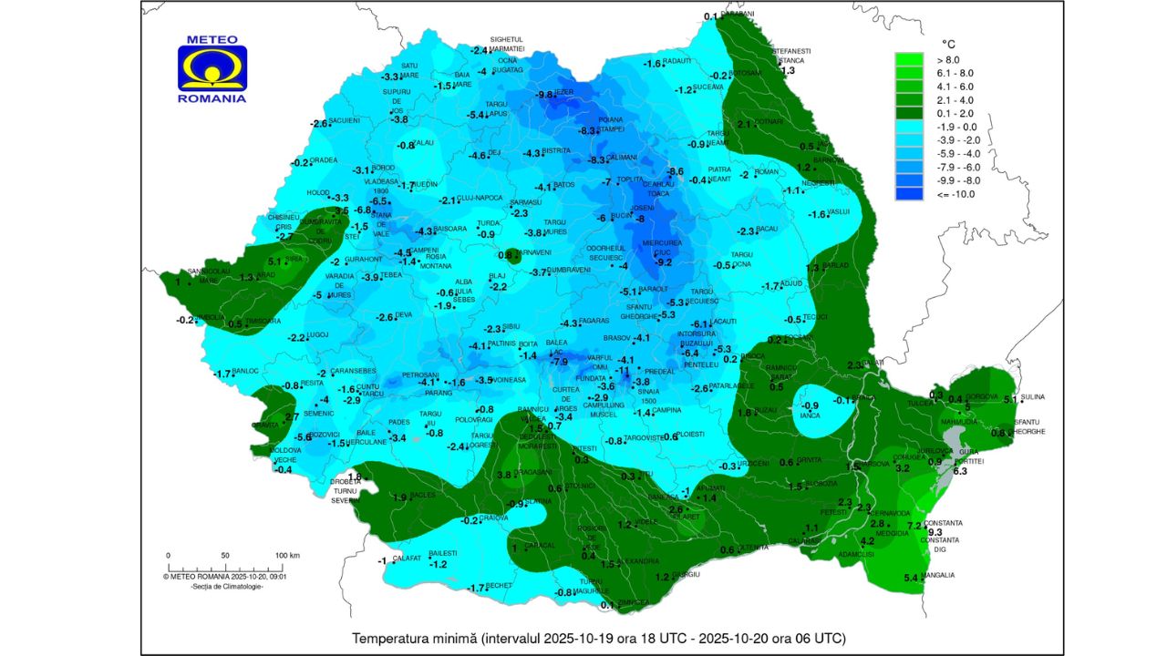 Dimineață geroasă de luni! Astăzi, luni – 20 octombrie, termometrele din România au înregistrat temperaturi negative. În mai multe localități, s-au înregistrat mai puțin de 0 grade Celsius. Cel mai frig a fost la Miercurea Ciuc, unde termometrele au măsurat -9 grade. Frigul s-a răspândit atât la munte, cât și în Muntenia și alte zone ale țării.
