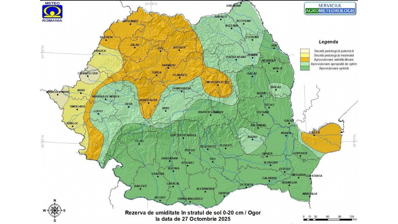 La data de 27 octombrie 2025, aprovizionarea cu apă pe adâncimea de sol 0-20 cm (ogor), se încadrează în limite satisfăcătoare, apropiate de optim și optime în Moldova, Maramureș, Dobrogea, Muntenia, Oltenia şi Transilvania, izolat nord-estul Banatului, sud-estul și nordul Crişanei.