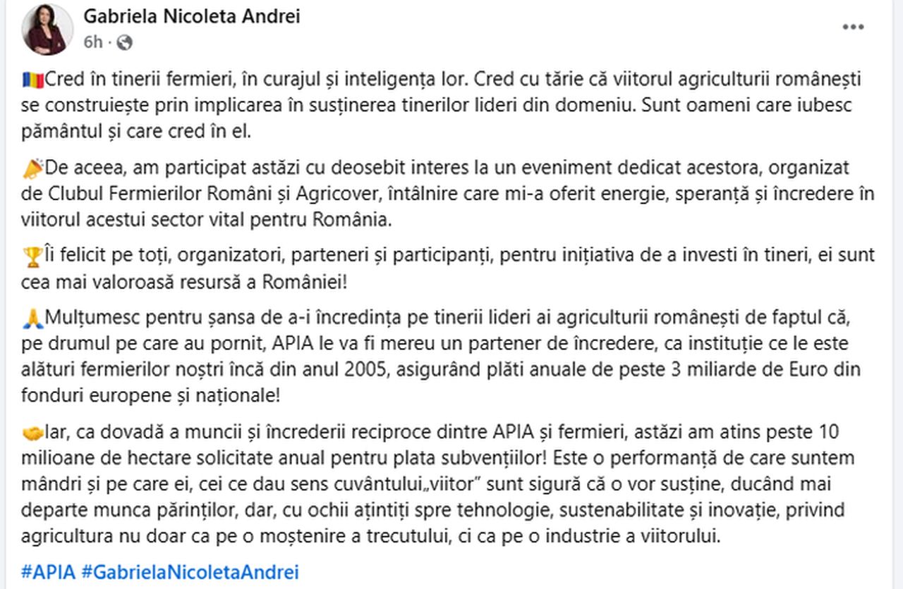 ”Ca dovadă a muncii și încrederii reciproce dintre APIA și fermieri, astăzi am atins peste 10 milioane de hectare solicitate anual pentru plata subvențiilor! Este o performanță de care suntem mândri și pe care ei, cei ce dau sens cuvântului„viitor” sunt sigură că o vor susține, ducând mai departe munca părinților, dar, cu ochii ațintiți spre tehnologie, sustenabilitate și inovație, privind agricultura nu doar ca pe o moștenire a trecutului, ci ca pe o industrie a viitorului”, a declarat șefa APIA luni, 28 octombrie.