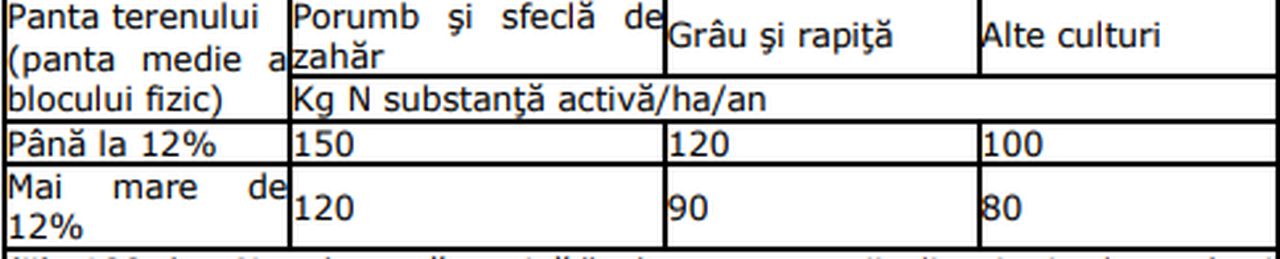 Cantitatea maximă de azot provenită din îngrăşăminte organice nu poate depăşi 170 kg N/ha/an iar cantitatea maximă de azot provenită din îngrăşăminte chimice, în cazul în care nu se execută studii agrochimice, nu poate depăşi: