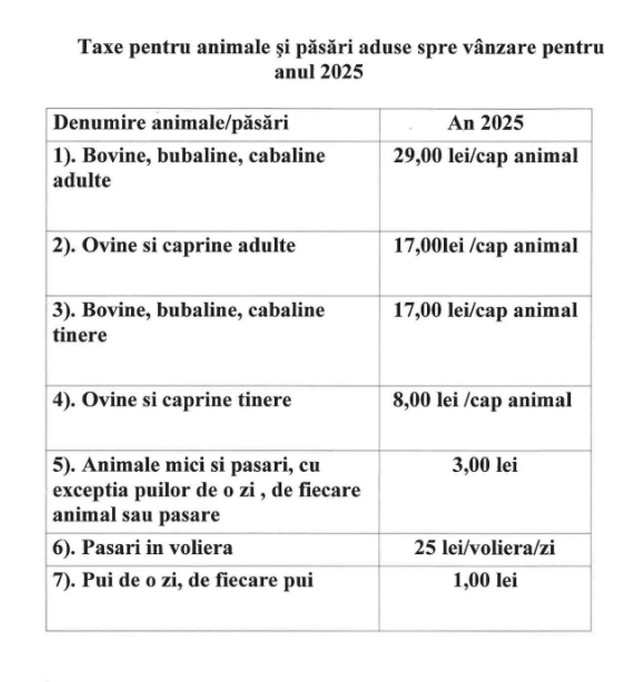 – Animale mici și păsări, cu excepția puilor de o zi, de fiecare animale sau pasăre: 3,00 lei/cap de animal;