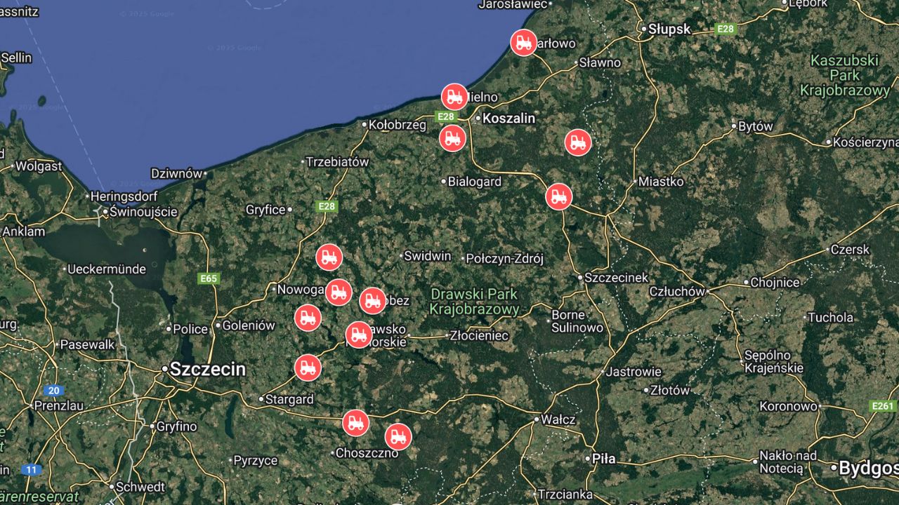 Harta protestelor acoperă un număr tot mai mare de municipalități – inclusiv Drawno, Recz, Węgorzyno, Dobra, Radowo Małe, Resko și Łobez – iar lista locațiilor este în continuă creștere. Camera de Agricultură din Pomerania de Vest a lansat o hartă interactivă, care este actualizată în timp real.