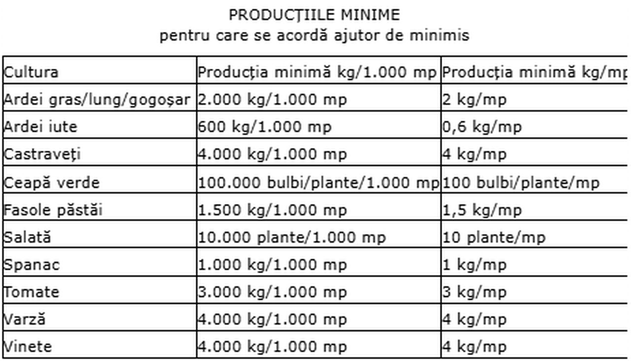 Fermierii care au accesat schema au fost obligați să facă dovada unor cantități minime valorificate cu documente, recoltele vândute fiind stabilite în funcție de tipul culturii: