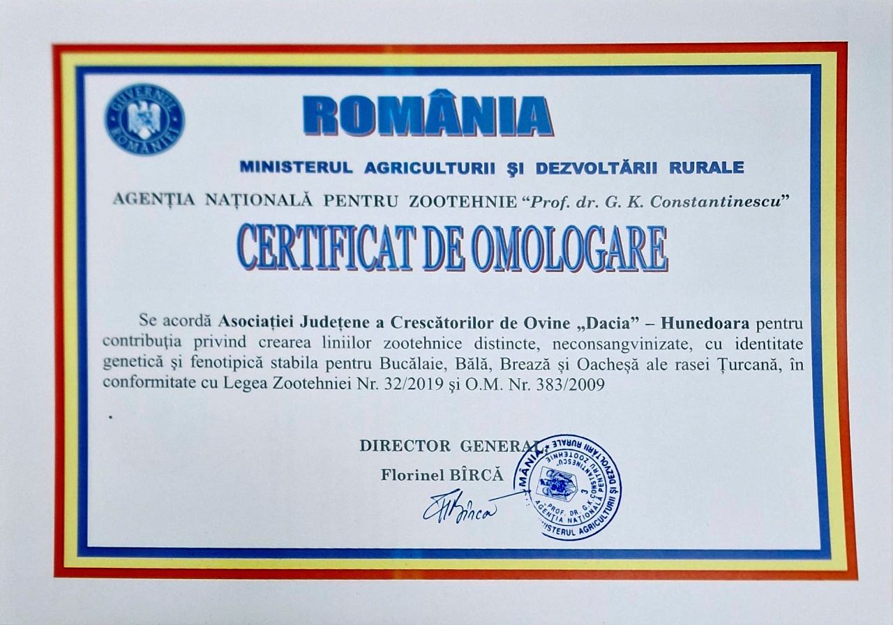 ”Se acordă Asociației Județene a Crescătorilor de Ovine Dacia – Hunedoara pentru contribuția privind crearea liniilor zootehnice distincte, neconsangvinizate, cu identitate genetică și fenotipică stabilă pentru Bucălaie, Bălă, Brează și Oacheșă ale rasei Țurcană, în conformitate cu Legea Zootehniei nr. 32/2019 și O.M. nr. 383/2009”, se arată în certificatul de omologare.