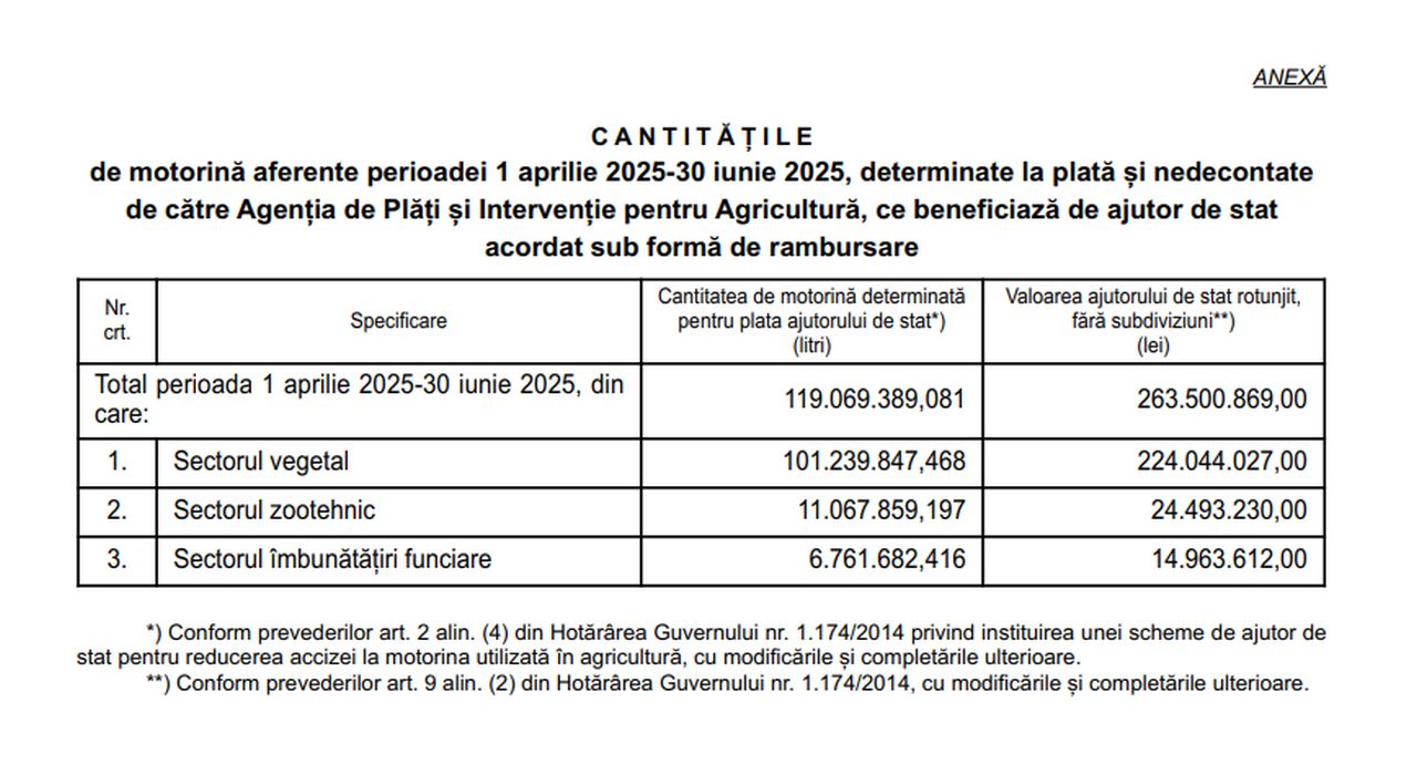 Astfel, cantitățile totale de motorină sunt de 119.069.389,081 litri, valoarea totală a ajutorului de stat aferent este de 263.500.869,00 lei. Plățile acoperă rambursările pentru trimestrul II din 2025, respectiv 1 aprilie 2025-30 iunie 2025, astfel: