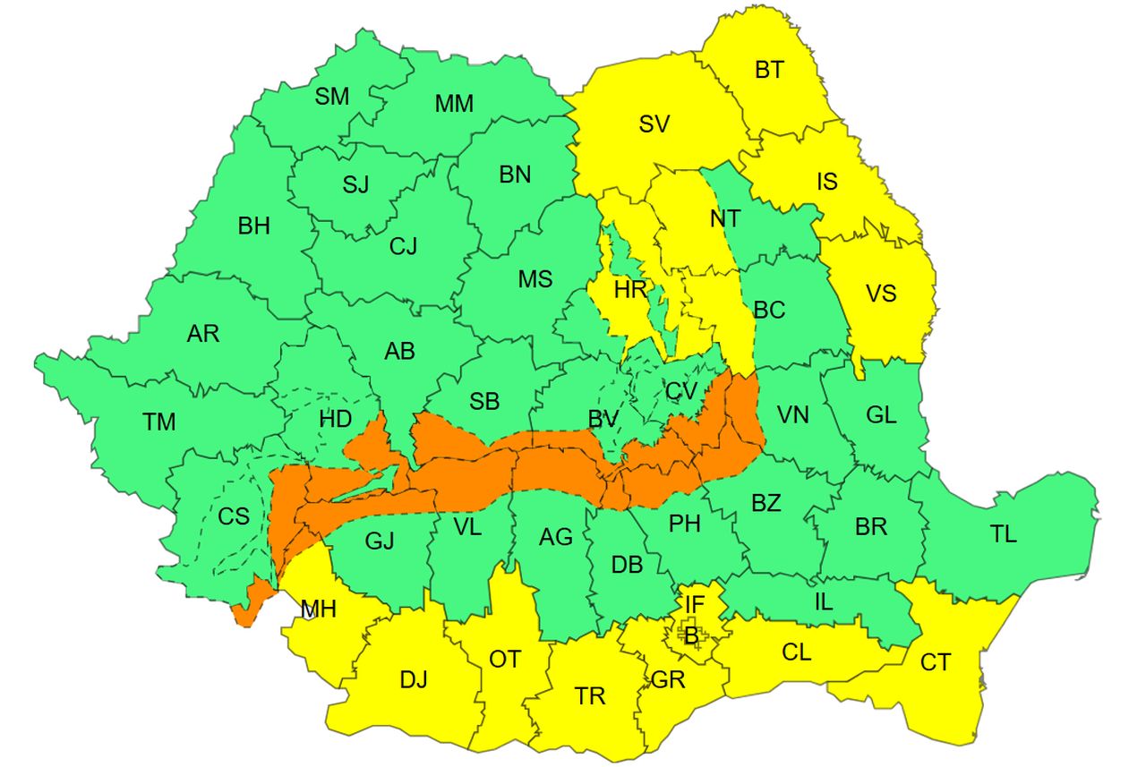 Zone avertizate: în județele Mehedinți, Dolj, Olt și Teleorman