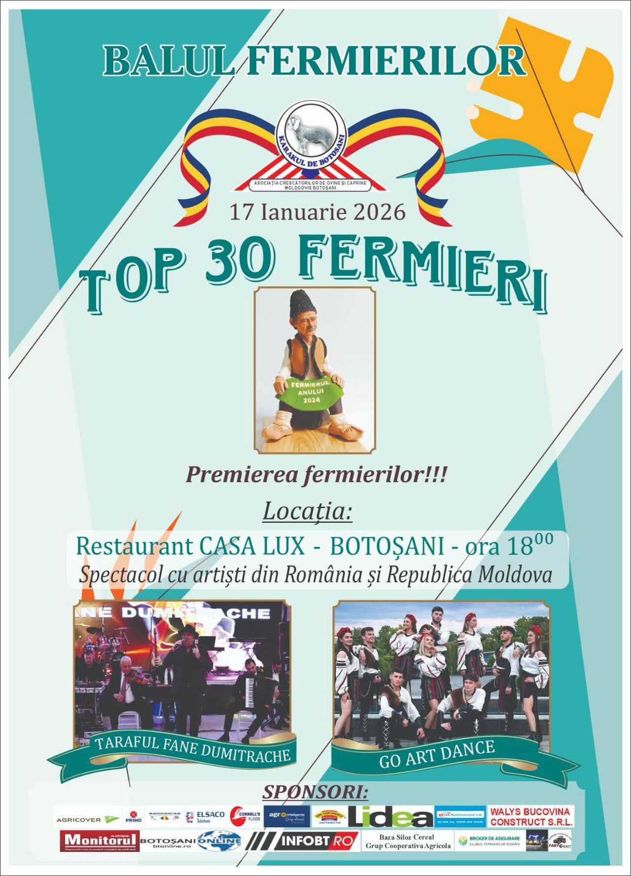 Cea de-a IX-a ediție a Balului Fermierilor se va desfășura pe 17 Ianuarie începând cu ora 18.00, la Restaurant Casa Lux Botoșani, potrivit informațiilor furnizate de Ionică Nechifor pentru Agrointeligența-AGROINTEL.RO. Cu această ocazie, cei mai performanți fermieri din zona Moldovei vor fi premiați în cadrul galei TOP 30 fermieri, printre care locul I fiind desemnat Fermierul anului.