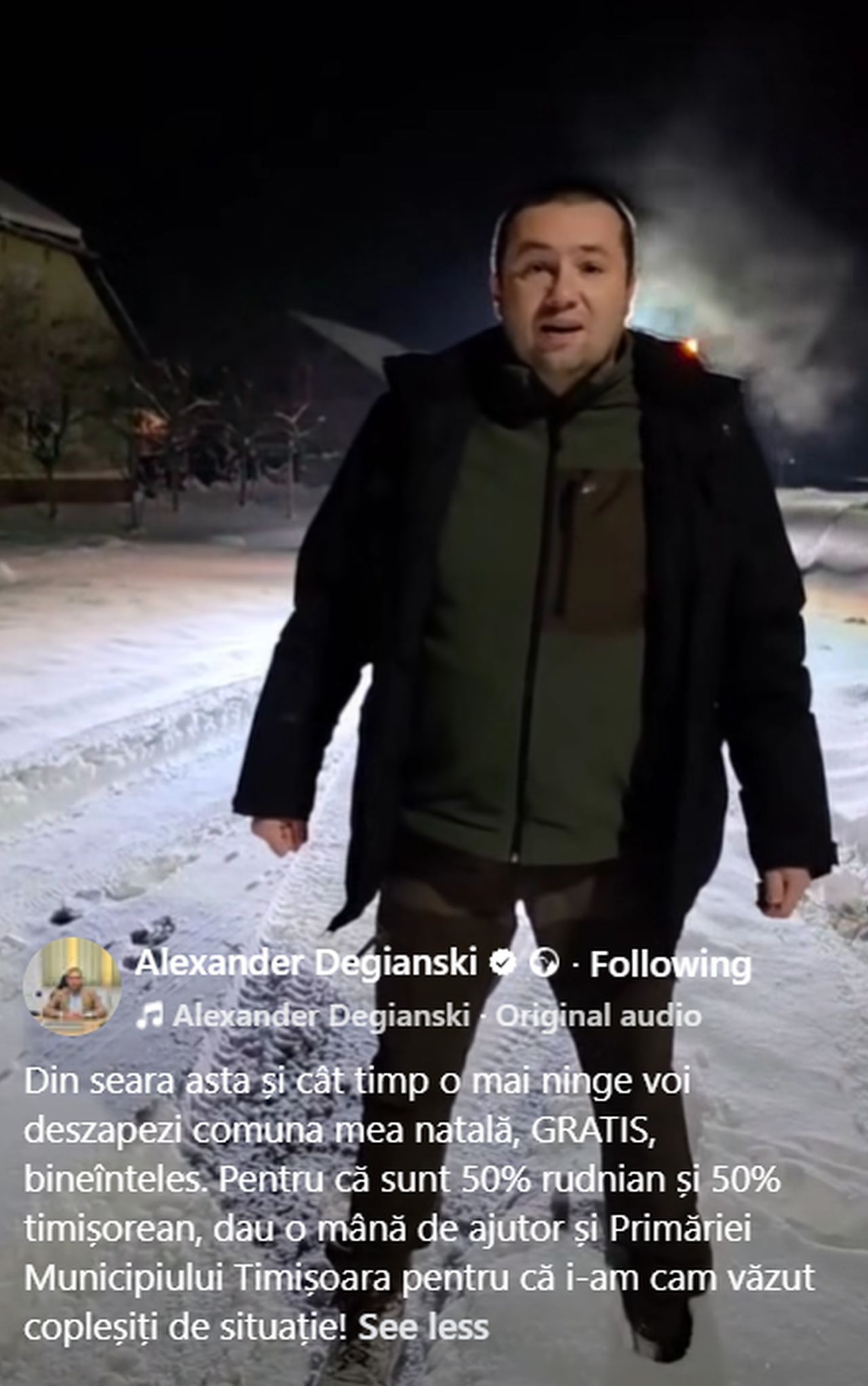 ”Din seara asta și cât timp o mai ninge voi deszăpezi comuna mea natală, GRATIS, bineînțeles. Pentru că sunt 50% rudnian și 50% timișorean, dau o mână de ajutor și Primăriei Municipiului Timișoara pentru că i-am cam văzut copleșiți de situație!”, a arătat fermierul din județul Timiș.