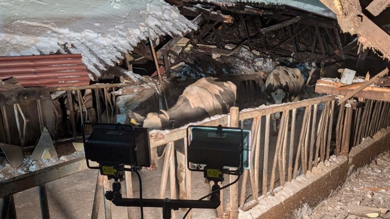 23 de animale – vaci și viței – se aflau în grajd în momentul prăbușirii. Pompierii și echipele de salvare au sosit rapid și au reușit să scoată 18 animale din clădire în jurul orei 9:00, restul vitelor urmându-le la scurt timp după aceea. Potrivit personalului de urgență, toate animalele au fost nevătămate și au fost mutate în alte grajduri. Nicio persoană nu a fost rănită. Cauza principală din nou invocată este greutatea zăpezii; ancheta este în curs de desfășurare.