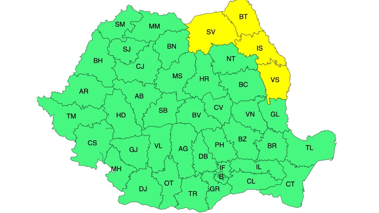 În nordul și estul Moldovei va fi ger, cu temperaturi maxime de -14…-10 grade, iar în sud-estul Moldovei și în Dobrogea vor fi temperaturi deosebit de scăzute, cu valori ce se vor încadra între -10 și -5 grade.