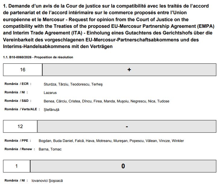Blocarea acordului UE-Mercosur s-a adoptat în Parlamentul European cu o diferența de numai 10 voturi. Exact 10 voturi pentru revizuirea juridică a acordului au exprimat cei 10 europarlamentari români ai PSD, înclinând balanța pentru trimiterea acordului UE-Mercosur la Curtea de Justiție a Uniunii Europene (CJUE).