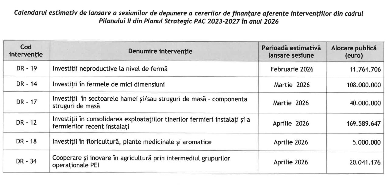 - DR 14 – Investiții în fermele de mici dimensiuni. Lansare: martie 2026. Buget alocat: 108 milioane de euro;