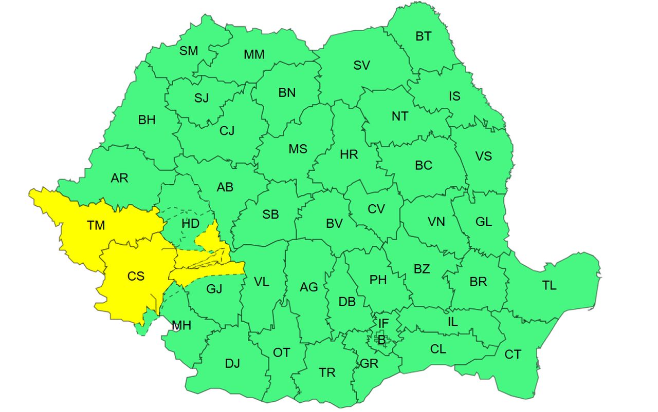 Vântul va avea intensificări în județul Caraș-Severin și local în județul Timiș, cu viteze de 50…70 km/h, iar în Munții Banatului și în zona înaltă din vestul Carpaților Meridionali, rafalele vor atinge 90…100 km/h, viscolind trecător ninsoarea.