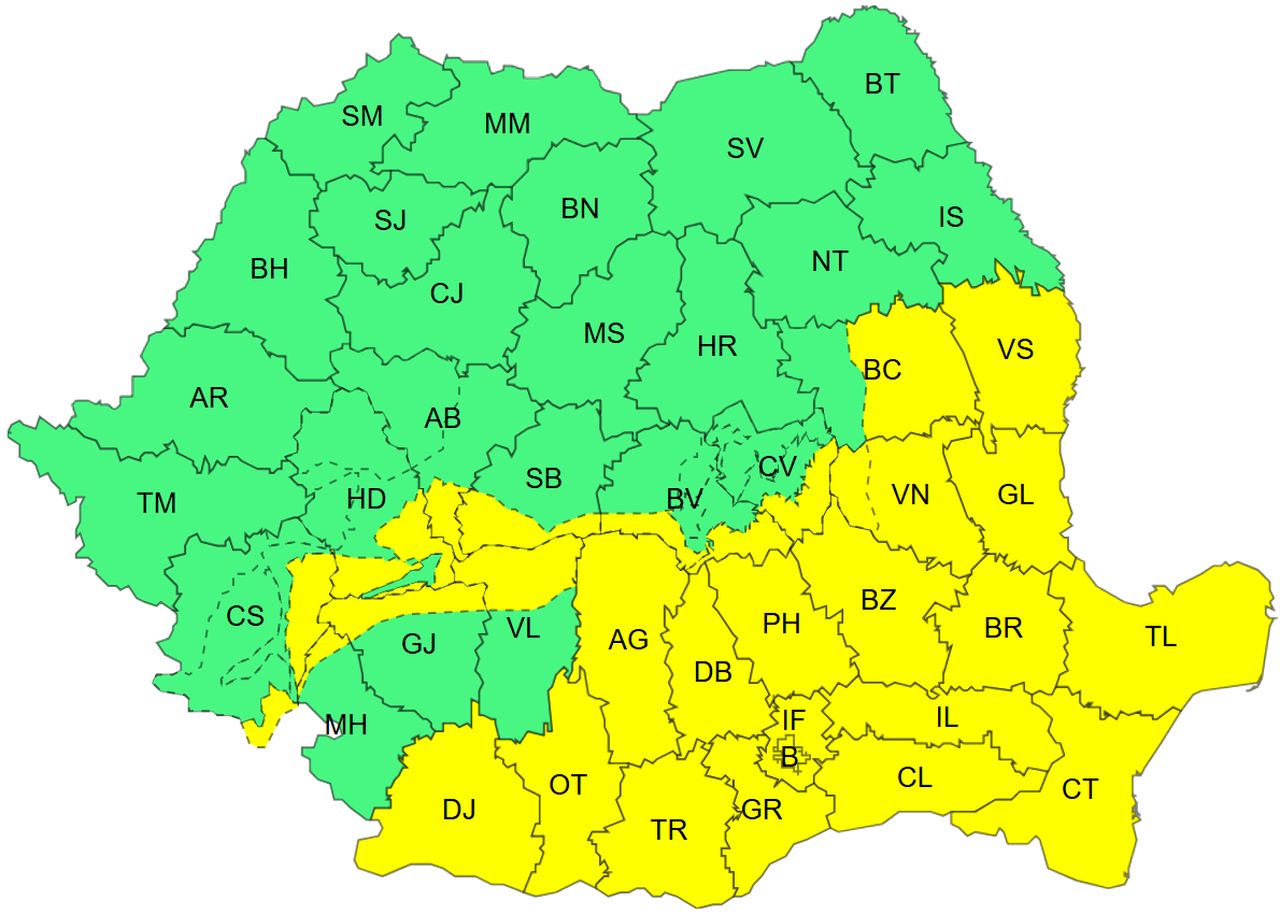 Fenomene vizate: răcire, precipitații în general moderate cantitativ, strat de zăpadă, polei, ghețus, intensificări ale vântului, viscol