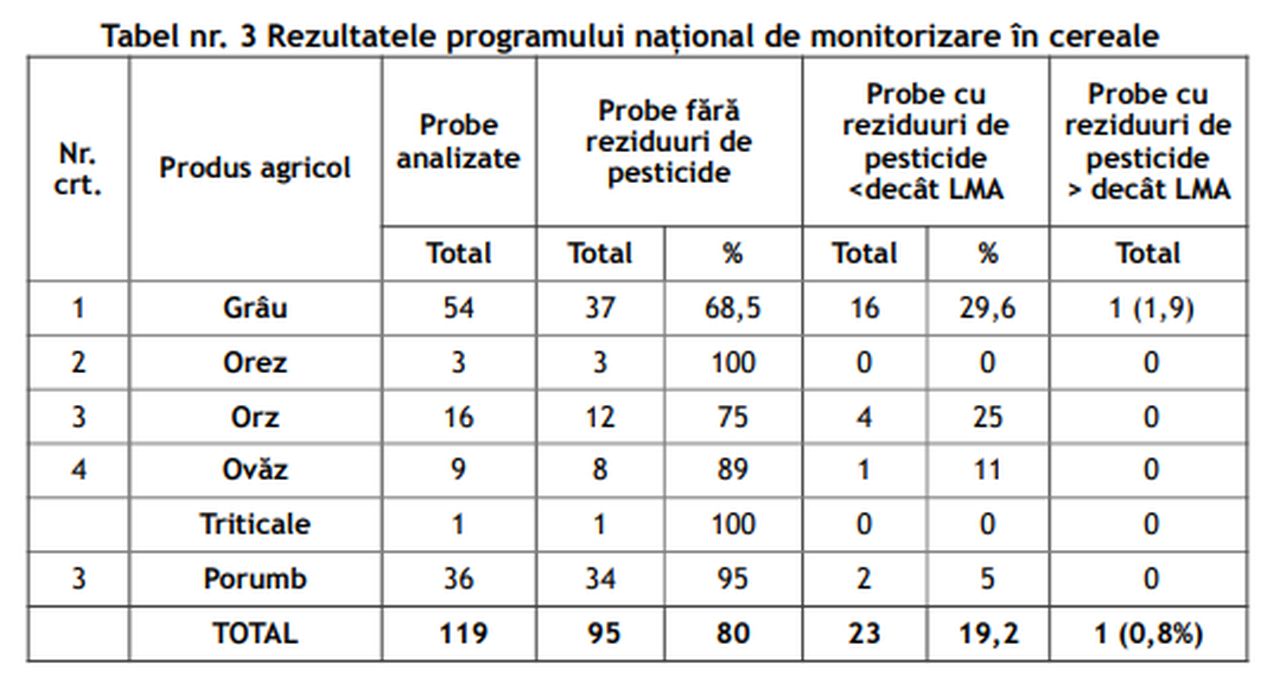 Rezultatele programului de monitorizare a reziduurilor de pesticide în cereale sunt prezentate în tabelul de mai jos: