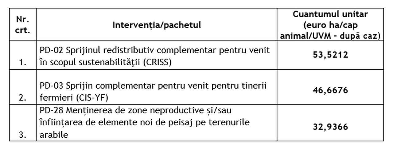 Cuantumurile unitare ale plăților directe pentru aceste intervenții sunt stabilite prin Ordinul MADR nr. 42/17.02.2026 pentru aprobarea cuantumului unitar al plăților directe aferente cererilor de plată depuse în anul 2025, finanțate din Fondul european de garantare agricolă prin intervențiile din cadrul Planului strategic PAC 2023-2027, publicat în Monitorul Oficial al României, Partea I, nr. 128/2026.