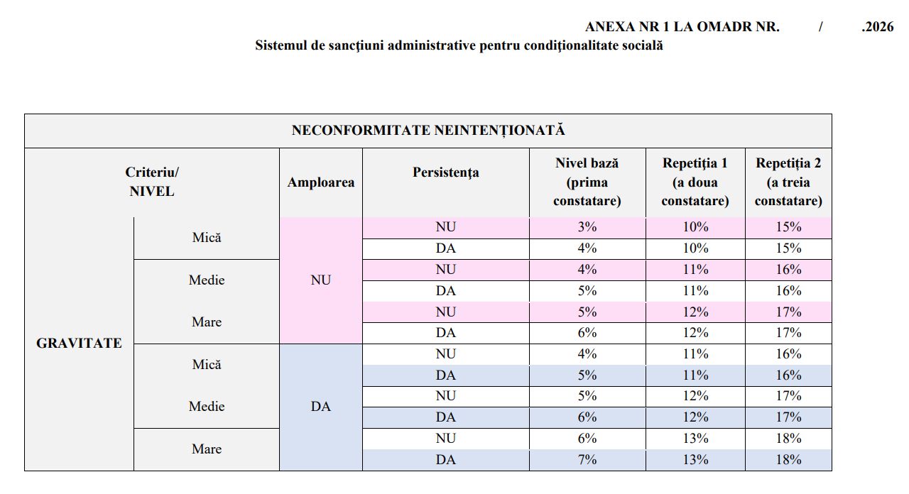 Sancțiunile pentru fermierii care au angajați sunt prevăzute într-un proiect de ordin publicat în dezbatere publică pe site-ul Ministerului Agriculturii și Dezvoltării Rurale (MADR). Sistemul de sancţiuni administrative pentru condiţionalitate socială se aplică beneficiarilor care primesc plăţi directe sau plăţi anuale prin intervenţiile pentru dezvoltare rurală.