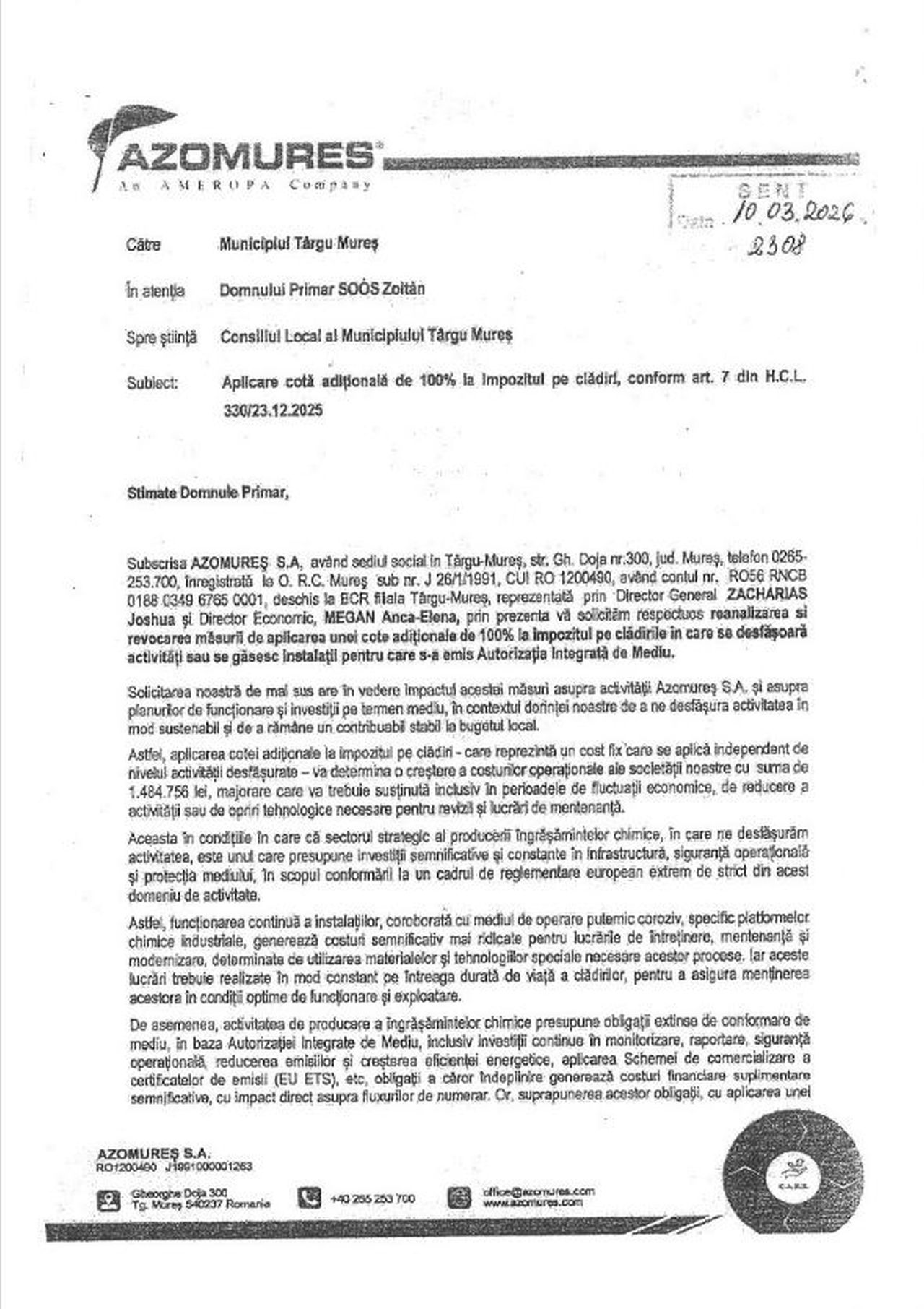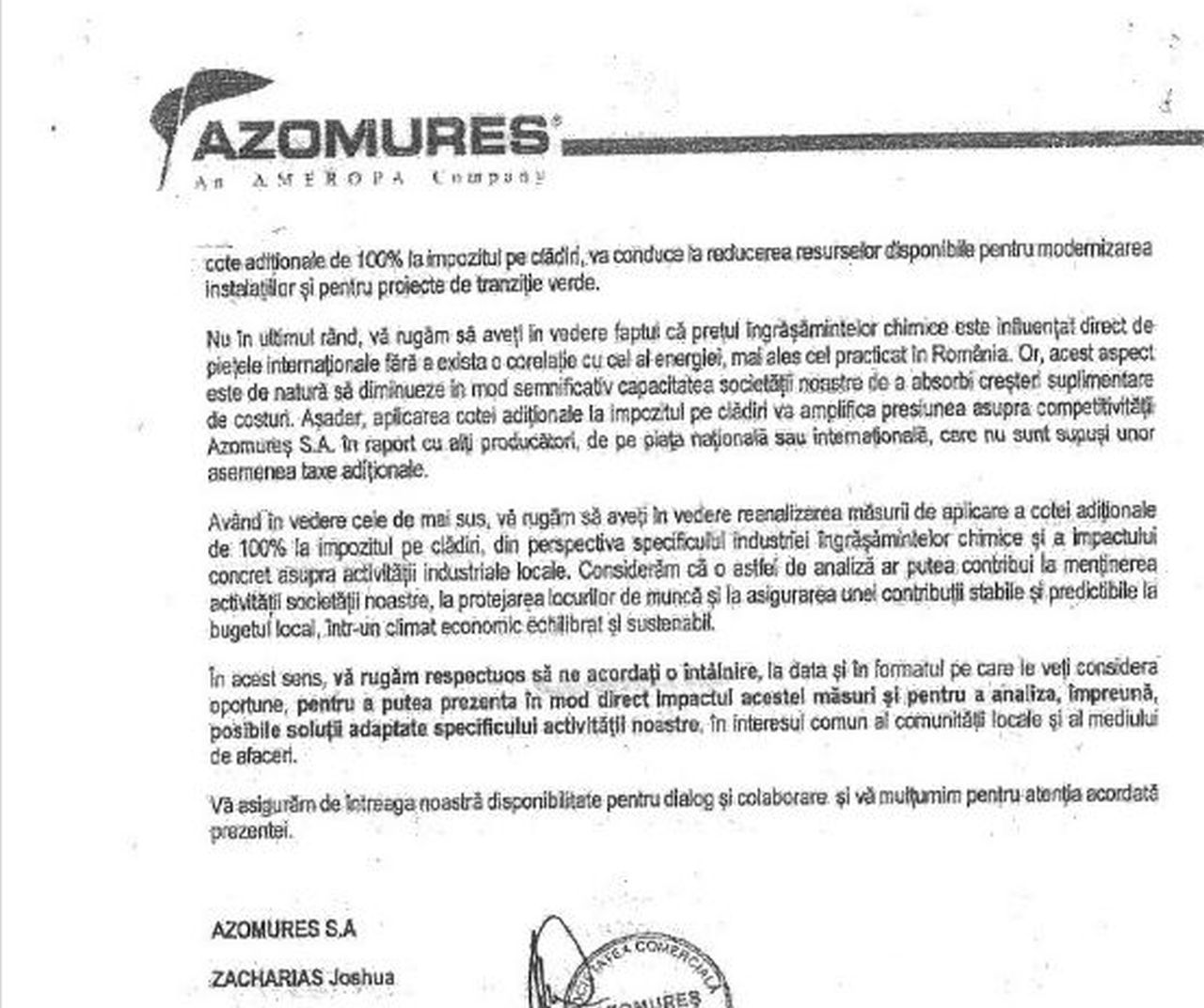 În documentul publicat în mediul online, directorul general al Azomureș, Joshua Zacharias și directorul economic al combinatului, Anca-Elena Megan, semnatarii adresei, cer reanalizarea și revocarea măsurii de aplicare a unei cote adiționale de 100% la impozitul pe clădirile în care se desfășoară activități sau se găsesc instalații pentru care s-a emis Autorizație Integrată de Mediu”. Aceștia susțin că solicitarea lor „se întemeiază pe impactul acestor măsuri asupra activității Azomureș S.A. și asupra planurilor de funcționare și investiții pe termen mediu, în contextul dorinței noastre de a ne desfășura activitatea în mod sustenabil și de a rămâne un contributor stabil la bugetul local”.