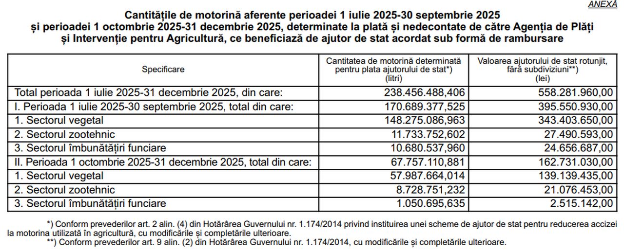 Cantitățile totale de motorină prevăzute pentru plățile pe trimestrele III și IV de anul trecut sunt de 238.456.488,406 litri, valoarea totală a ajutorului de stat aferent este de 558.281.960 lei.
