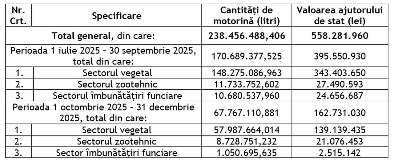 – 395.550.930 lei – trimestrul III 2025 – pentru un număr total de 17.259 beneficiari cu o cantitate de 170.689.377,525 litri motorină;