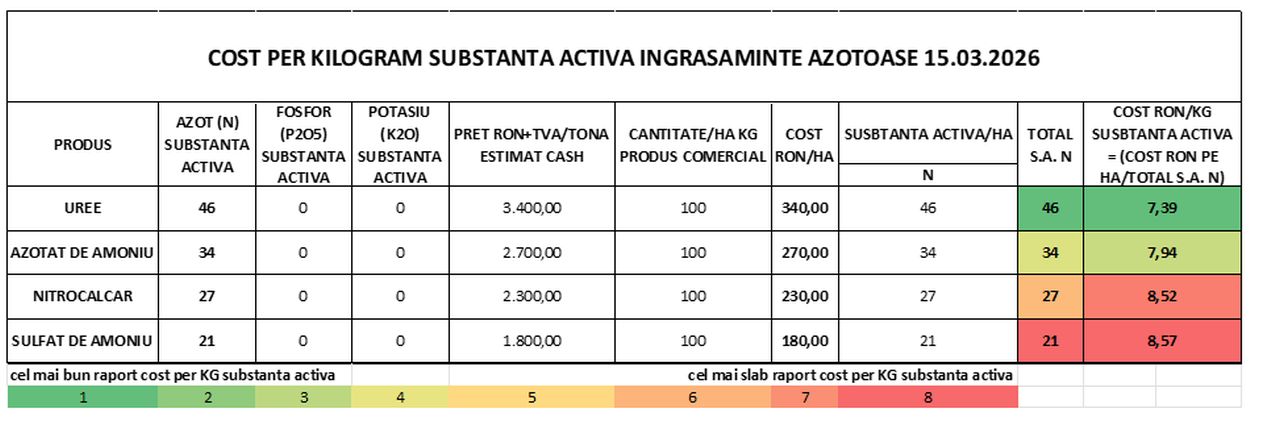 ”Să privim cifrele concrete pentru a înțelege diferența la o ofertă de îngrășăminte din 15.03.2026: Ureea costă 7.39 lei + TVA per kilogram de substanță activă. Sulfatul de amoniu cosă 8.57 lei + TVA per kilogram de substanță activă. În acest context, sulfatul de amoniu este cu 15.5% mai scump decât ureea. Prin omiterea calculului raportat la substanță activă, un fermier poate avea impresia că face o economie de 1.600 lei pe tonă (diferența dintre prețul ureei de 3.400 lei/tona și cel al sulfatului de amoniu de 1.800 lei/tona). În esență, însă, acesta cumpără azotul la un preț mult mai ridicat.