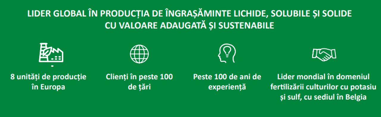 Cu peste un secol de experiență, o prezență globală în peste 100 de țări și opt unități de producție de ultimă generație în Europa, acest lider cu sediul în Belgia continuă să redefiniească excelența în domeniul nutriției culturilor cu potasiu și sulf. Cu focus pe sustenabilitate și inovare, acesta se impune ca un partener de încredere în furnizarea de îngrășăminte lichide, solubile și solide cu
