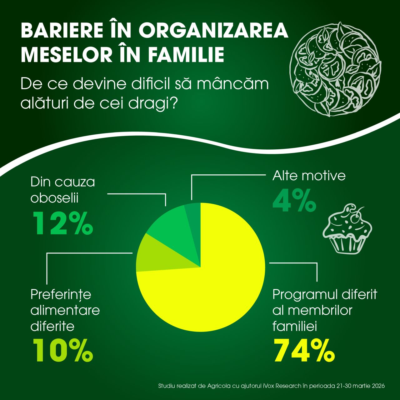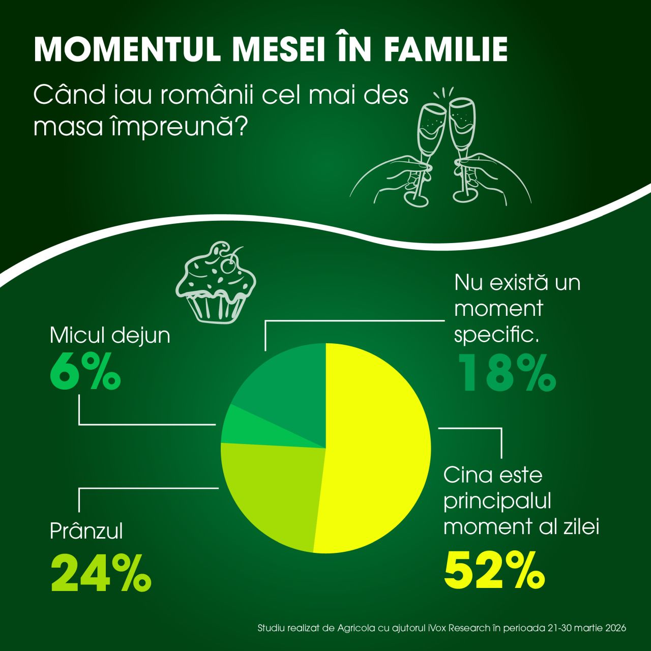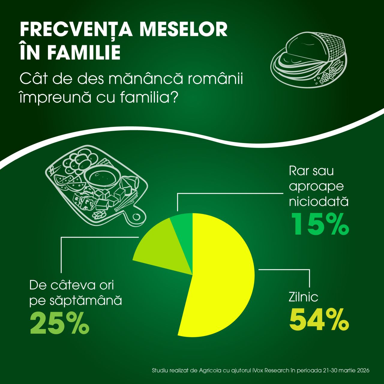 În apropierea Paștelui, una dintre perioadele din an în care masa în familie capătă o semnificație aparte, Agricola Internațional a lansat studiul „Mesele în familie la români”, care arată că pentru români, mesele luate împreună sunt asociate cu alegeri alimentare mai bune, timp de calitate petrecut cu cei apropiați și mai multă grijă față de familie.