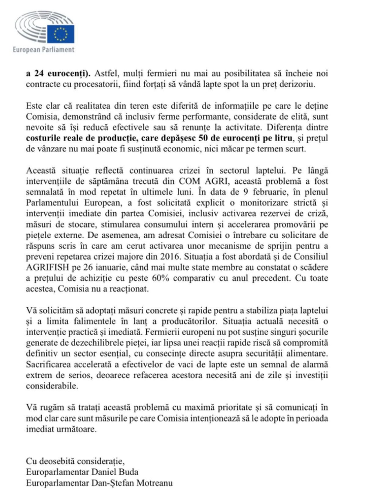 Eurodeputatul român a semnalat că fermierii nu mai pot face față costurilor de producție, care se situează la 1,8 – 2 lei/litru, în timp ce prețul de vânzare la poarta fermei este de doar 1,5 – 1,6 lei/litru.