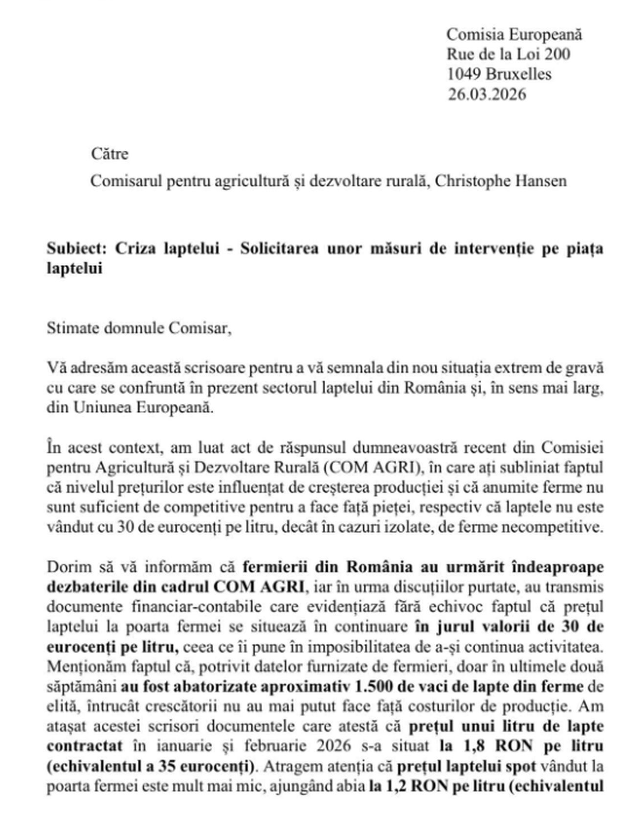 ”Împreună cu colegul meu, europarlamentarul Dan Motreanu, am trimis o scrisoare oficială către comisarul european pentru agricultură, Christophe Hansen, în care am prezentat, cu date concrete, situația gravă din sectorul laptelui din România și am cerut de îndată intervenția Comisiei Europene”, a mai spus Daniel Buda.