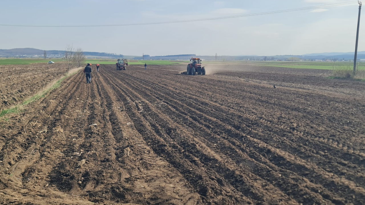 Primarul supraveghează lucrările de însămânțare, iar viceprimarul conduce tractorul.