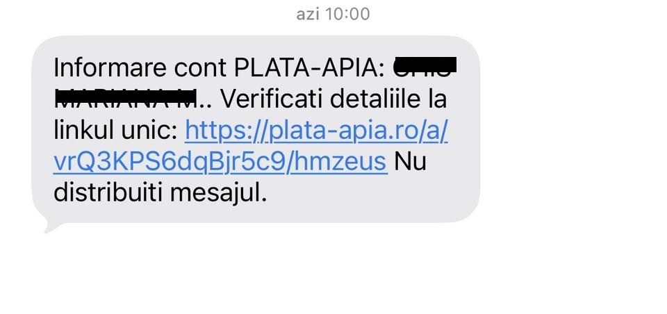 ”În acest context, facem precizarea că APIA NU solicită niciodată prin SMS date de autentificare, user, parole, coduri de acces sau informații privind conturile beneficiarilor.