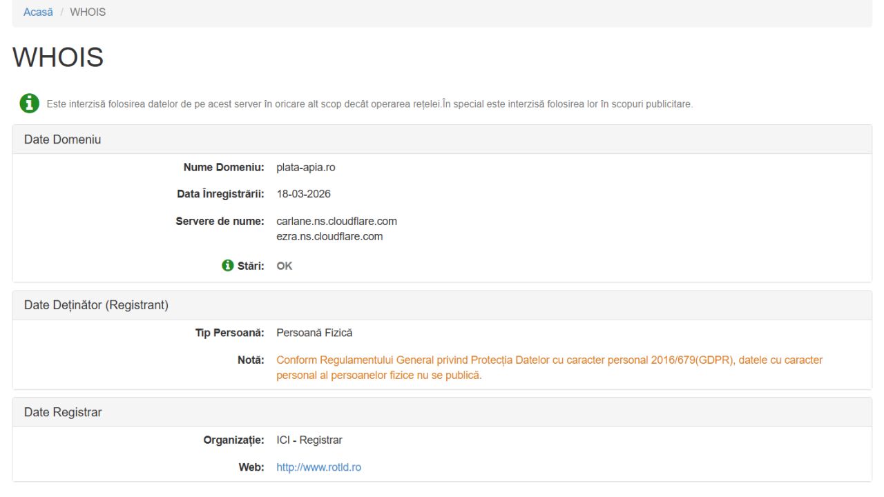 Adresa plata-apia.ro a fost înregistrată în data de 18 marție, adică fix în urmă cu o lună de atacul de astăzi. La această oră, acel url face în continuare redirecționare direct în site-ul oficial al APIA – apia.org.ro care a denunțat atacul încă de la ora 15:12.
