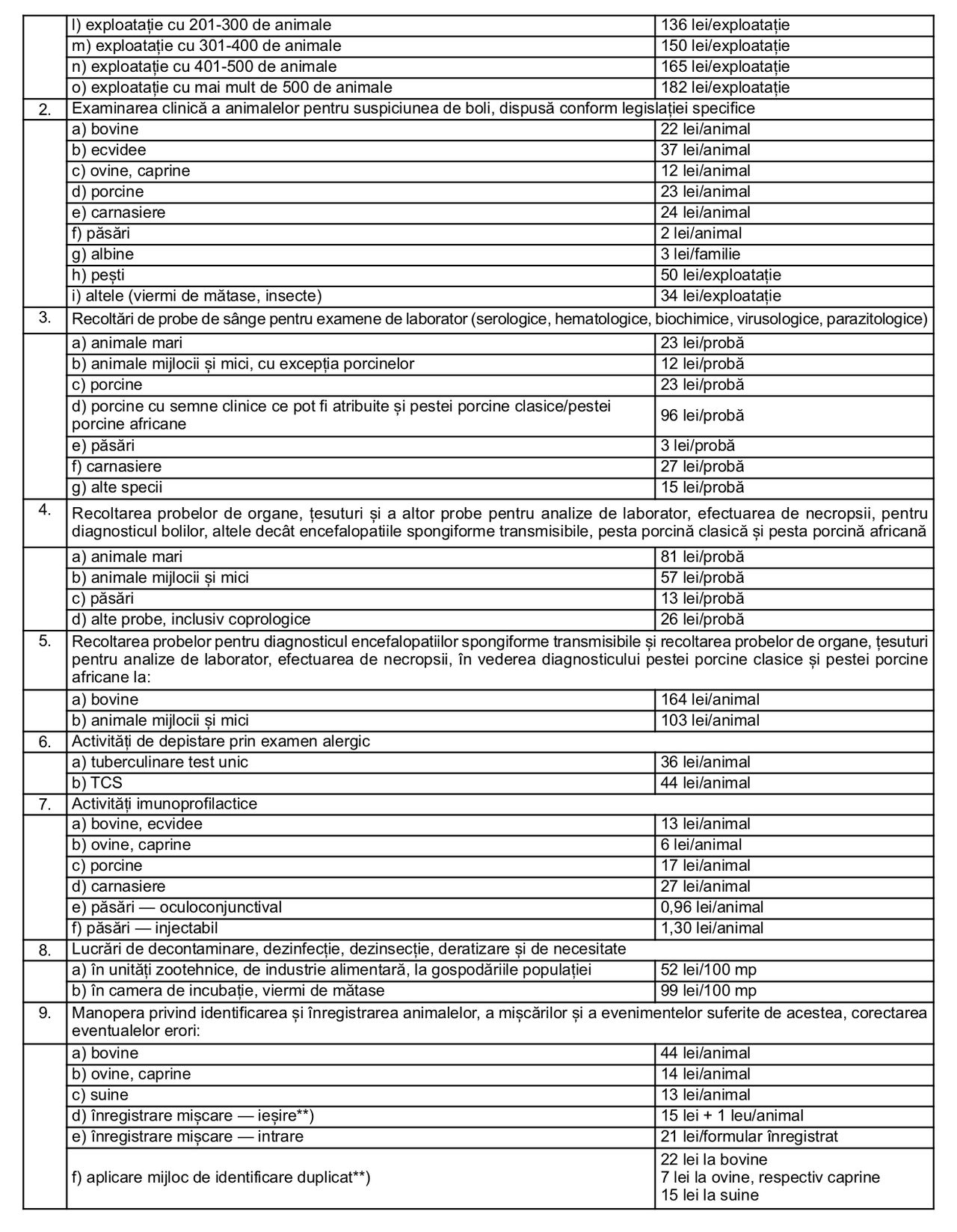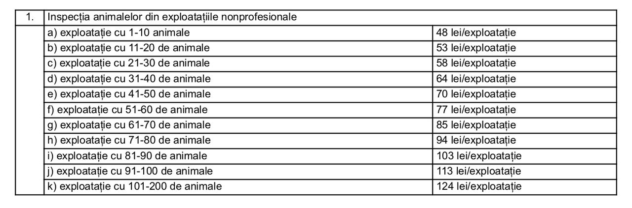 Actul normativ ce intră în vigoare la trei zile de la publicarea în Monitorul Oficial aduce o actualizare, în creștere, a tarifelor veterinare pe care le practică medicii concesionari pentru serviciile efectuate la nivelul exploatațiilor agricole. De precizat că numai o parte dintre tarife sunt decontate de la bugetul de stat în baza constractelor-cadru încheiate cu medicii veterinari concesionari. O altă parte sunt suportate direct de către crescătorii de animale. Astfel, între tarifele pe care le suportă fermierii se numără inspecţia animalelor vii din speciile bovine, ovine, caprine şi ecvidee, cu altă destinaţie decât sacrificarea, acolo unde, la bovine, această inspecție a crescut, pentru un lot cuprins între 1 şi 5 animale, de la 41 de lei la 45 de lei.