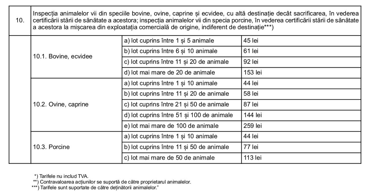 La ovine, un lot cuprins între 1 şi 10 animale, tariful a crescut de la 40 de lei la 44 de lei, iar la un lot mai mare, de peste 100 de animale, de la 238 de lei, actualul tarif este de 259 de lei, adică  majorare de 21 de lei.